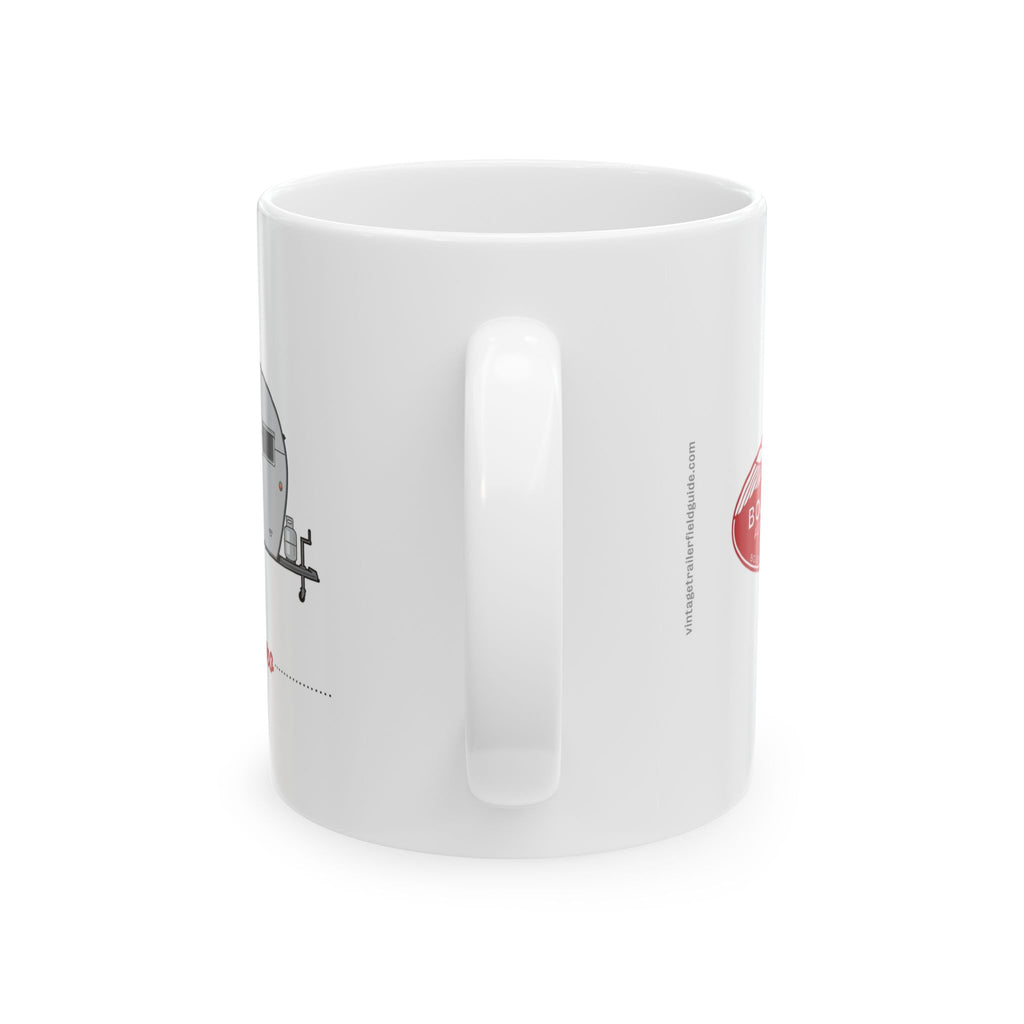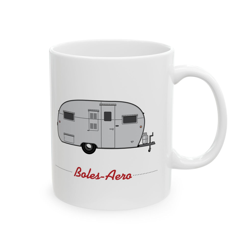 Illustrated in fine detail, a vintage Boles-Aero trailer and manufacturer emblem adorn the front and back of this classic hot beverage mug.