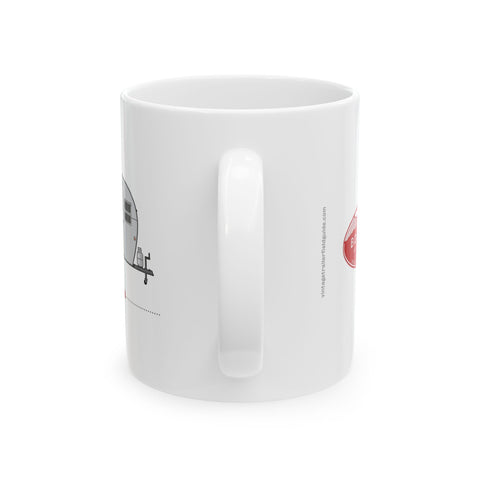 Illustrated in fine detail, a vintage Boles-Aero Mira Mar trailer and manufacturer emblem adorn the front and back of this classic hot beverage mug.