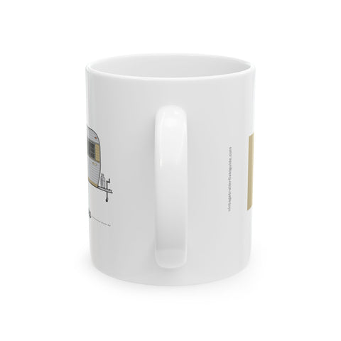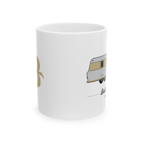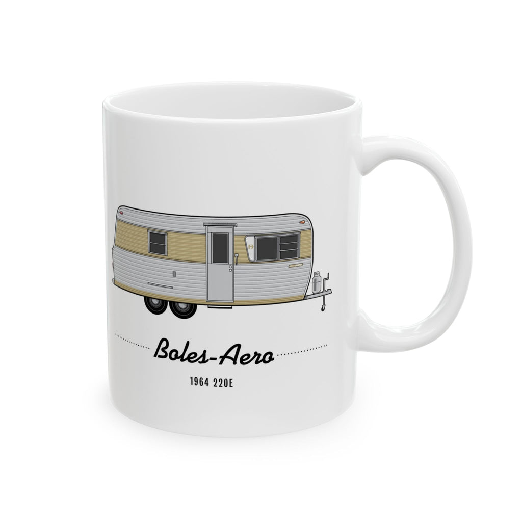 Illustrated in fine detail, a vintage Boles-Aero trailer and manufacturer emblem adorn the front and back of this classic hot beverage mug.