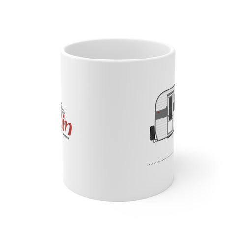 Illustrated in fine detail, a vintage Aladdin trailer and manufacturer logo adorn this classic hot beverage mug.