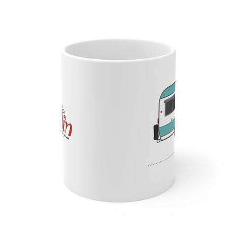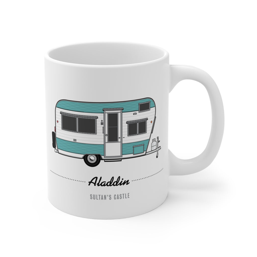 Illustrated in fine detail, a vintage Aladdin trailer and manufacturer logo adorn this classic hot beverage mug.