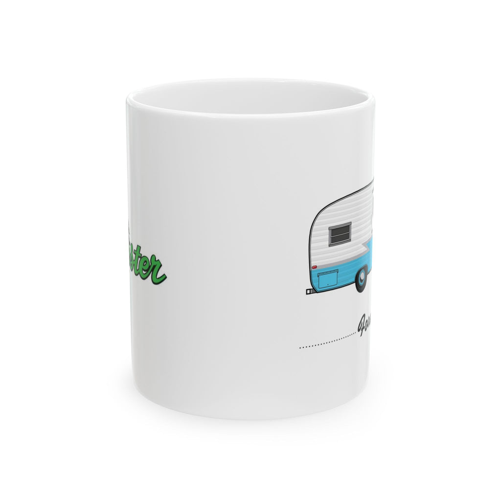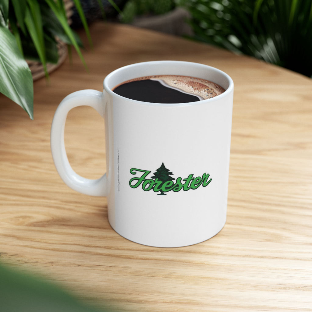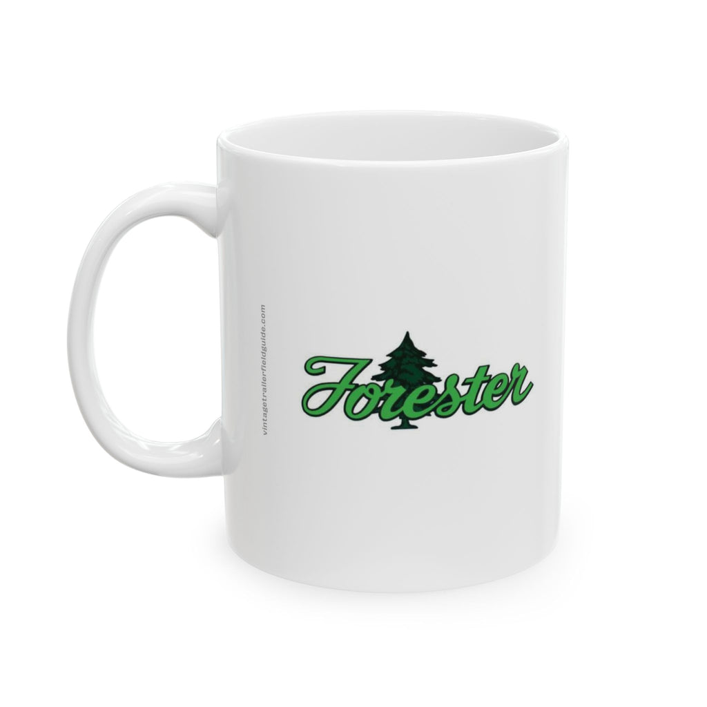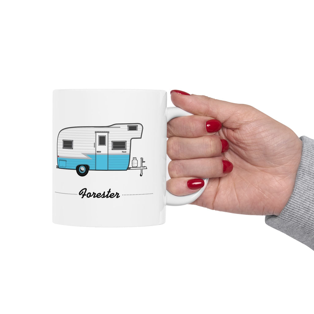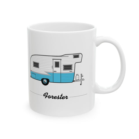 Illustrated in fine detail, a vintage Forester trailer and manufacturer logo adorn this classic hot beverage mug.