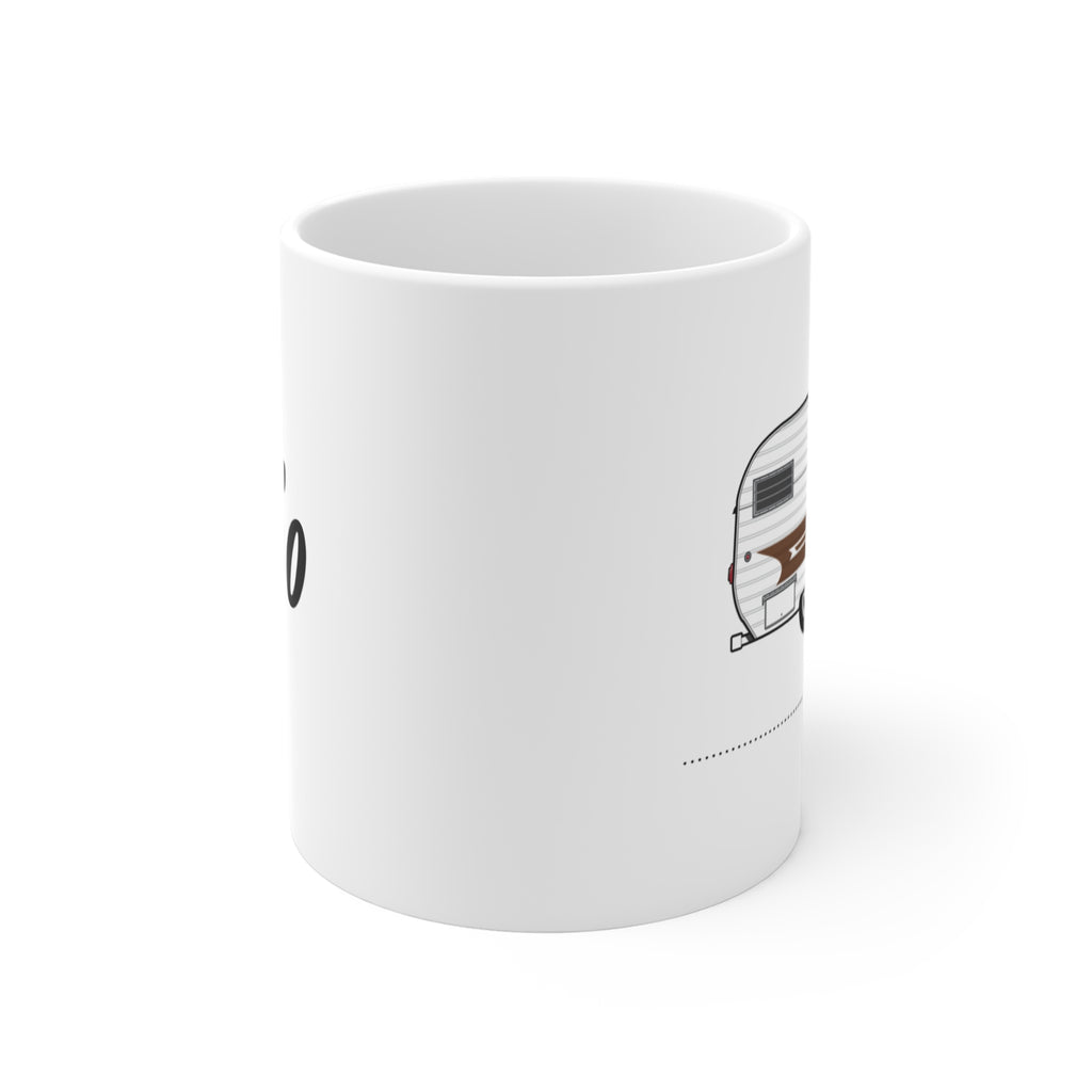 Illustrated in fine detail, a vintage Aljo trailer and manufacturer logo adorn this classic hot beverage mug.