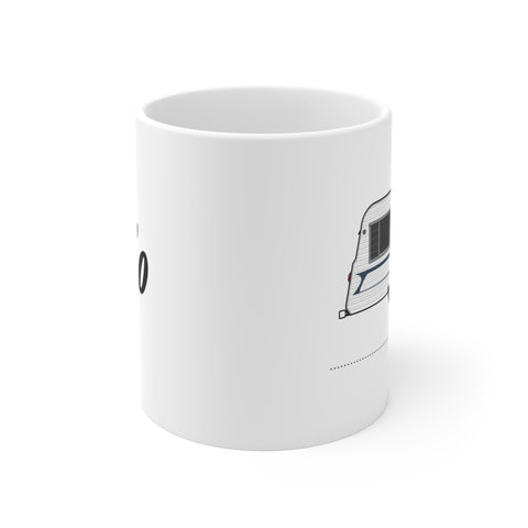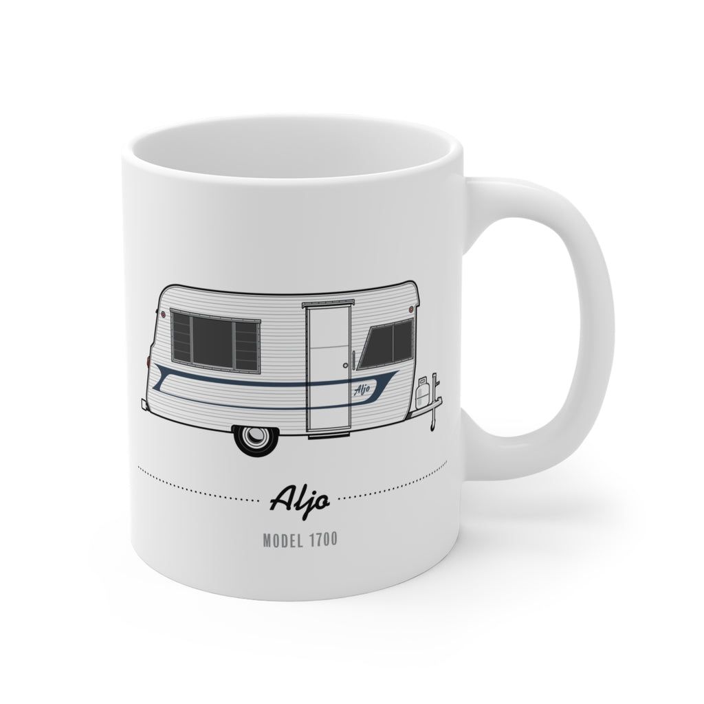 Illustrated in fine detail, a vintage Aljo trailer and manufacturer logo adorn this classic hot beverage mug.