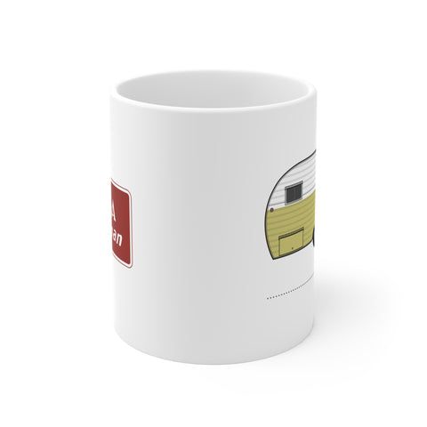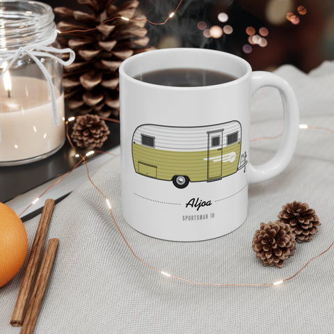 Illustrated in fine detail, a vintage Aljoa trailer and manufacturer logo adorn this classic hot beverage mug.