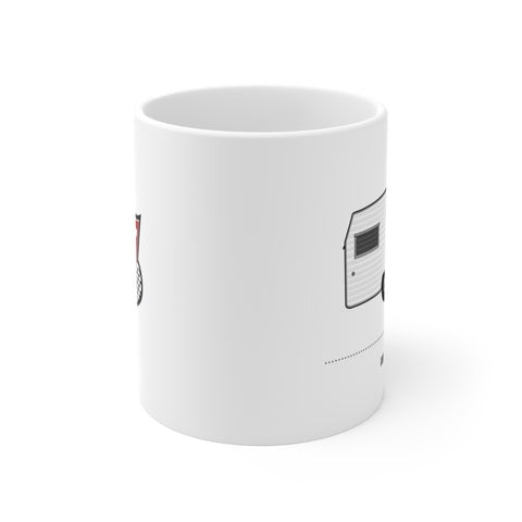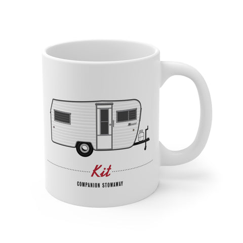 Illustrated in fine detail, a vintage Kit trailer and manufacturer logo adorn this classic hot beverage mug.