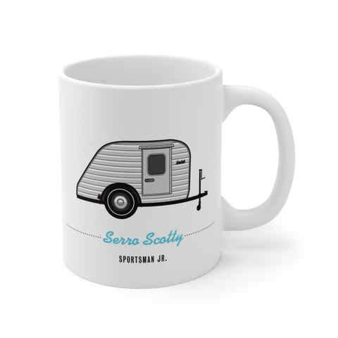 Illustrated in fine detail, a vintage Serro Scotty trailer and manufacturer logo adorn this classic hot beverage mug.