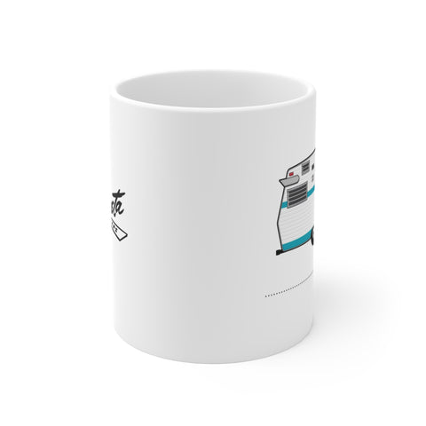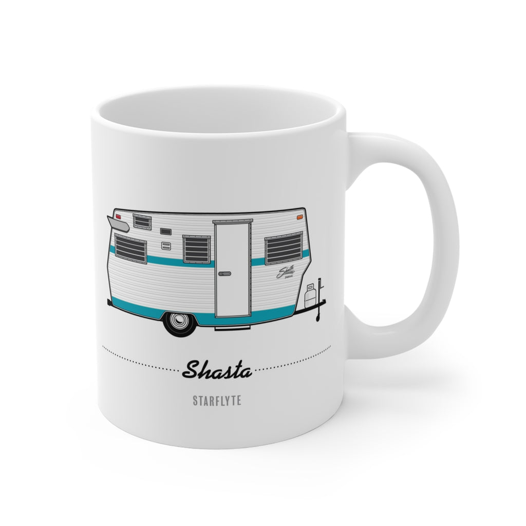 Illustrated in fine detail, a vintage Shasta trailer and manufacturer logo adorn this classic hot beverage mug.
