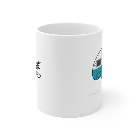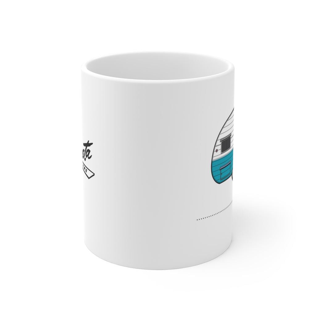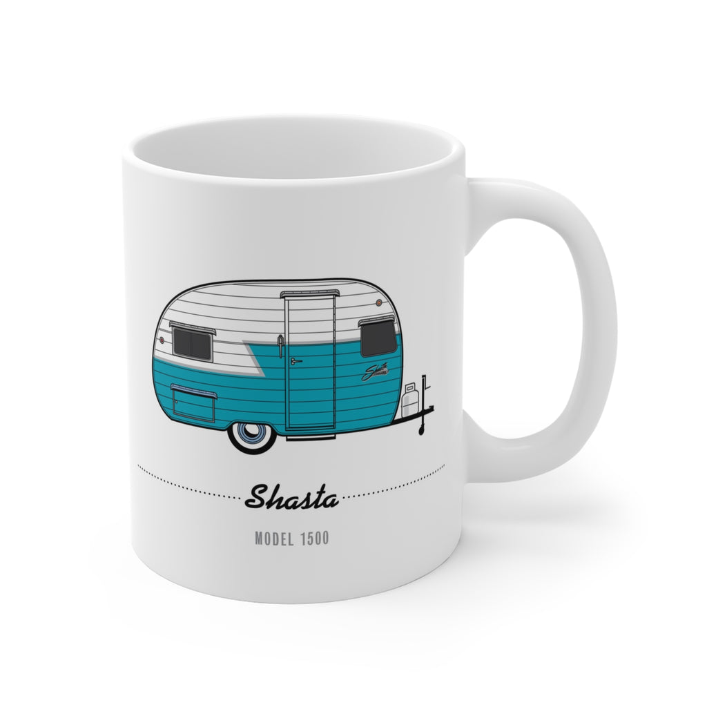 Illustrated in fine detail, a vintage Shasta trailer and manufacturer logo adorn this classic hot beverage mug.