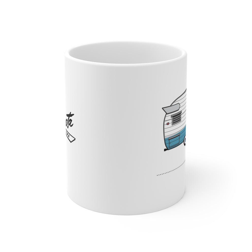 Illustrated in fine detail, a vintage Shasta trailer and manufacturer logo adorn this classic hot beverage mug.